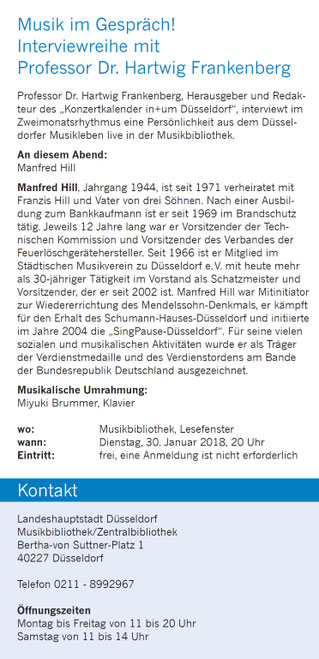昨日は"Musik im Gespräch! (会話の中での音楽!)" ‐Hartwig Frankenberg氏によるインタビュー・シリーズ- にてピアノでご一緒させていただく機会を得ました。昨日のゲストはデュッセルドルフ市立音楽協会会長Manfred Hill氏でした。お二人の会話はとても興味深かったです!