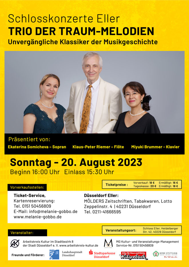 Wahrliche Traummelodien weltberühmter Klassiker erfüllen bei diesem Konzert den Prinzensaal von Schloss Eller und lassen das Publikum gedanklich in eine Welt eintauchen, bei denen Feierlichkeiten auf Schlössern ganz besonders zelebriert wurden wie im Rahmen von Hofkonzerten, wichtigen Anlässen zu denen zum Ball eingeladen wurde. Konzertflötist Klaus-Peter Riemer, Sopranistin Ekaterina Somicheva und Pianistin Miyuki Brummer konzertieren an bekannten Bühnen. Für dieses Konzert hält das Künstler-Trio weltbekannte Klassiker bereit, in dem auch die Spuren ihrer internationalen Konzertreisen eingebunden werden. So werden die Zuhörer von Melodien wie von Johann Strauß „Rosen aus dem Süden“, „Donauwalzer“, „Barkarole“ von Jacque Offenbach, die in zahlreichen Filmen integriert wurde, Chopin, Mozart, Donizetti und vielen anderen unvergänglichen Kompositionen verzaubert.